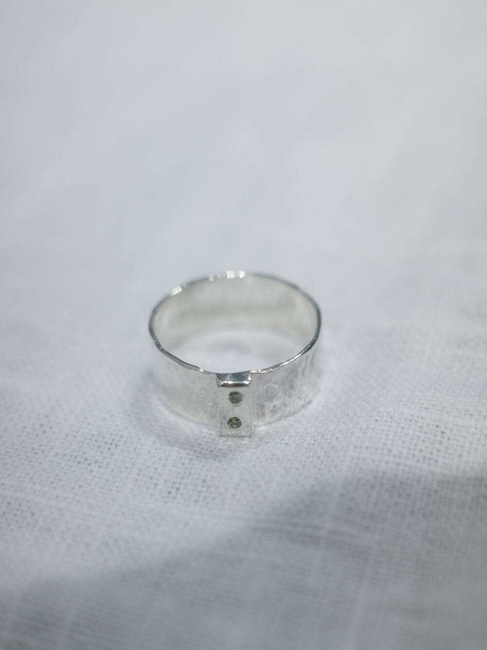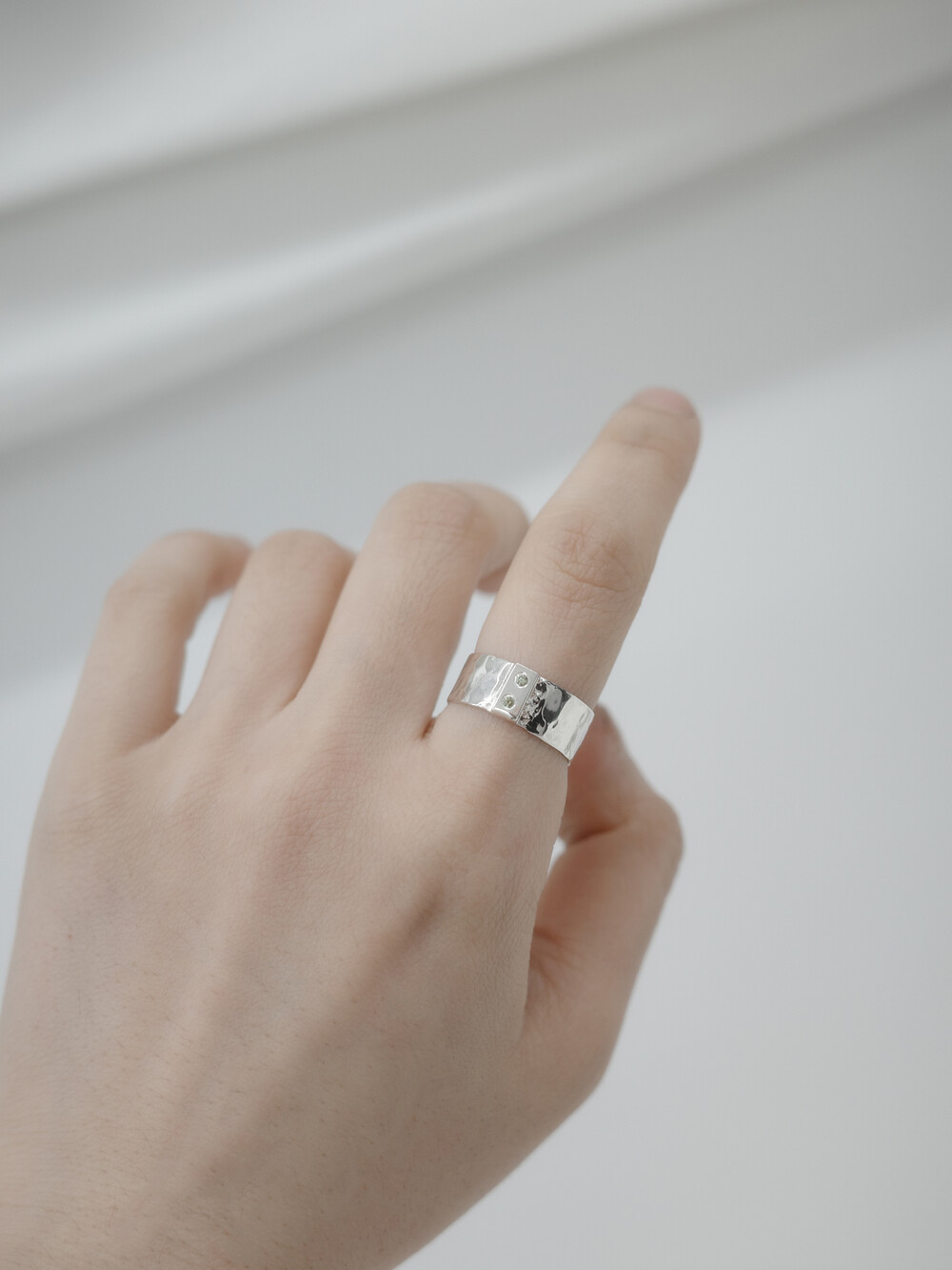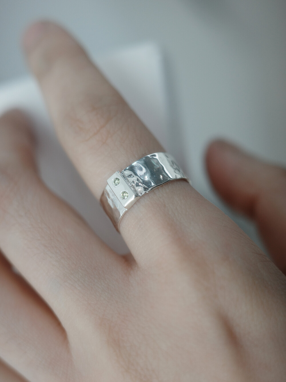 셔츠의 단추를 모티프로 중앙에 위치한 두 개의 작은 보석은 단추 구멍을 형상화하여 조각하였습니다.망치로 불규칙한 텍스처를 만들고, 반짝이는 광택감을 더해 고급스러움을 더했습니다.단추라는 일상의 사물에 공예의 손길을 더해 착용자에게 소중한 의미를 더했습니다.