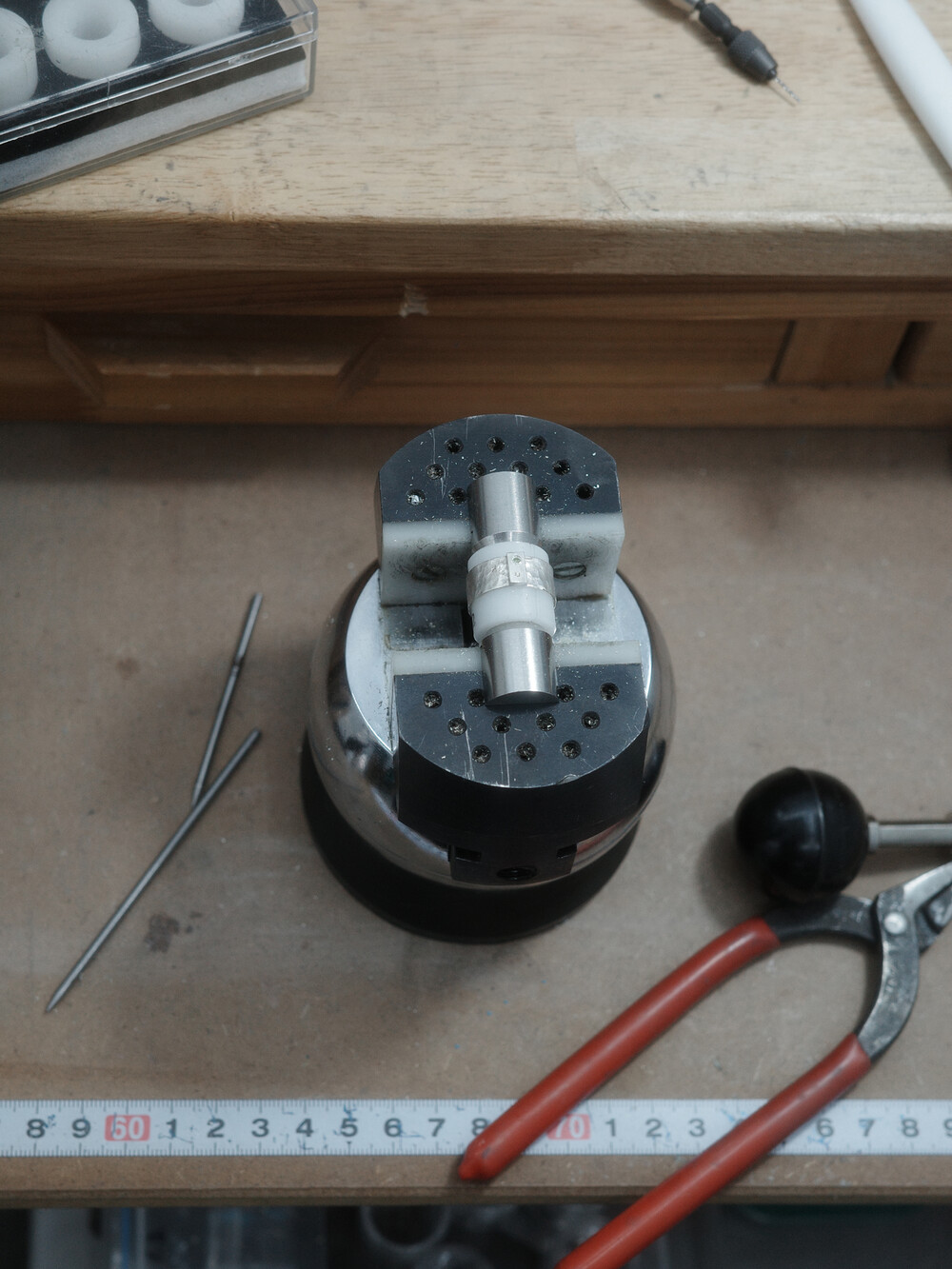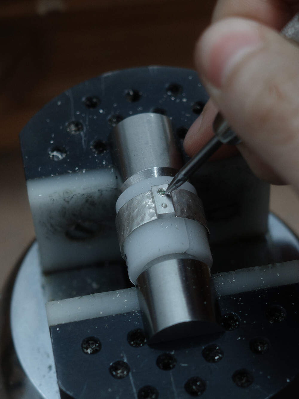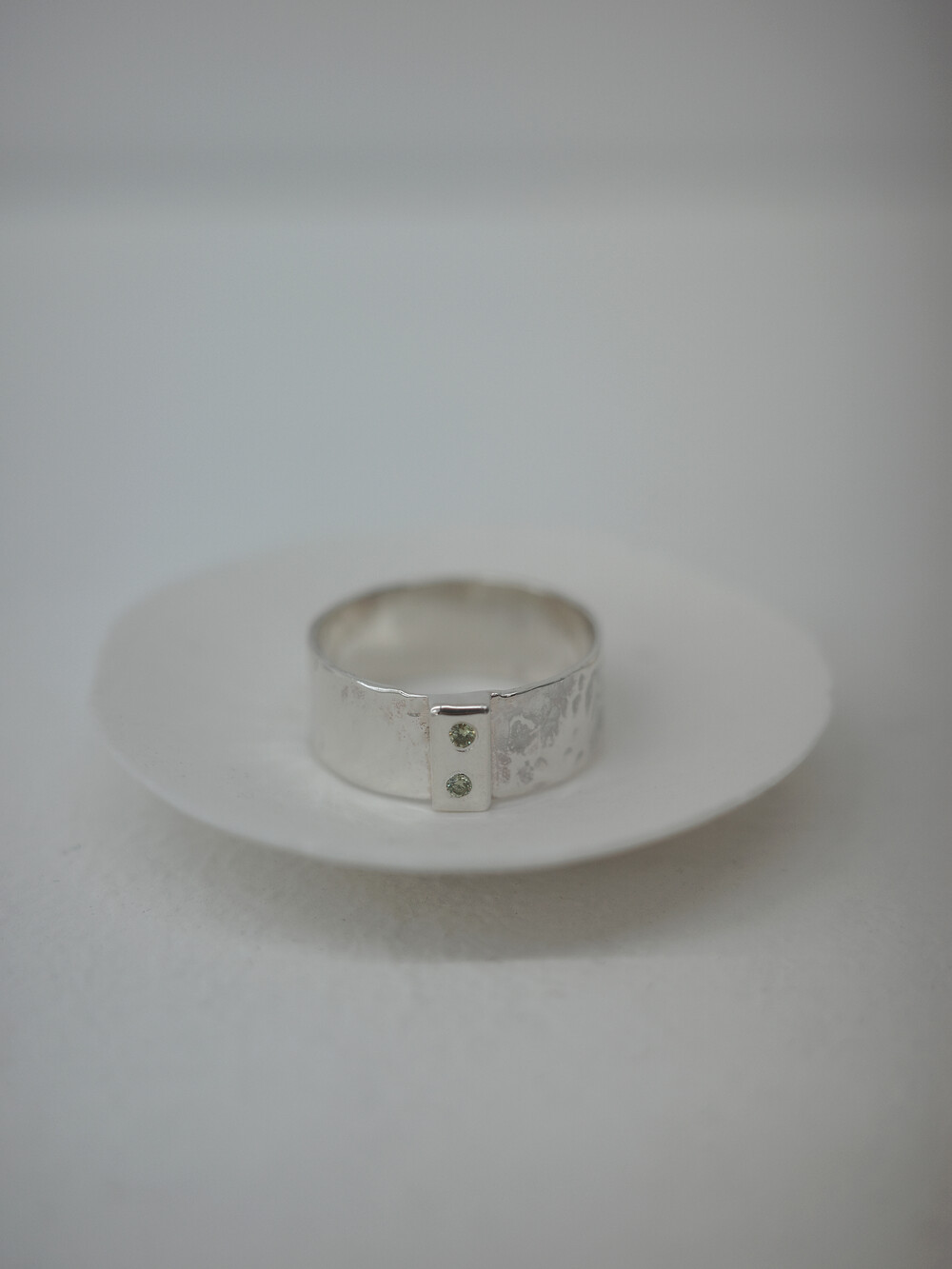 셔츠의 단추를 모티프로 중앙에 위치한 두 개의 작은 보석은 단추 구멍을 형상화하여 조각하였습니다.망치로 불규칙한 텍스처를 만들고, 반짝이는 광택감을 더해 고급스러움을 더했습니다.단추라는 일상의 사물에 공예의 손길을 더해 착용자에게 소중한 의미를 더했습니다.