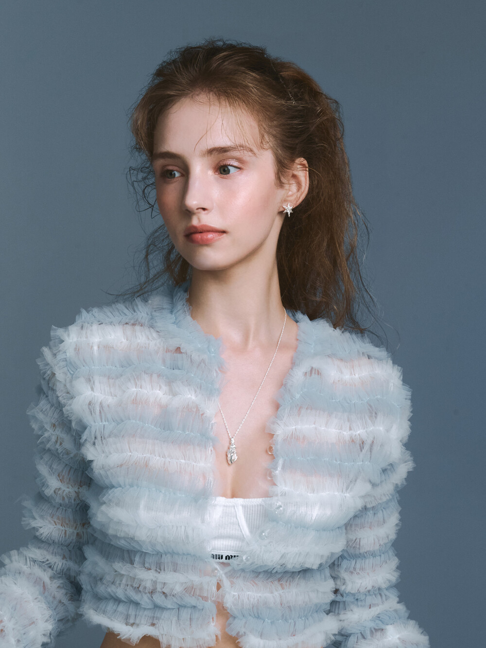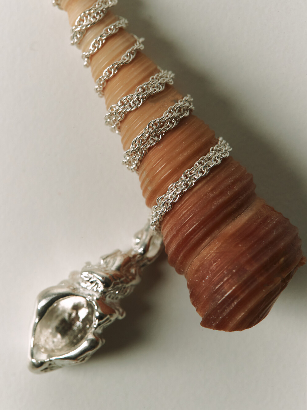 소라고동에 귀를 기울이면 바다의 이야기가 들린다는 전통적인 신념을 시각적으로 표현한 이 목걸이는, 바다의 고요한 속삭임을 시각과 촉각으로 느낄 수 있는 작품입니다.