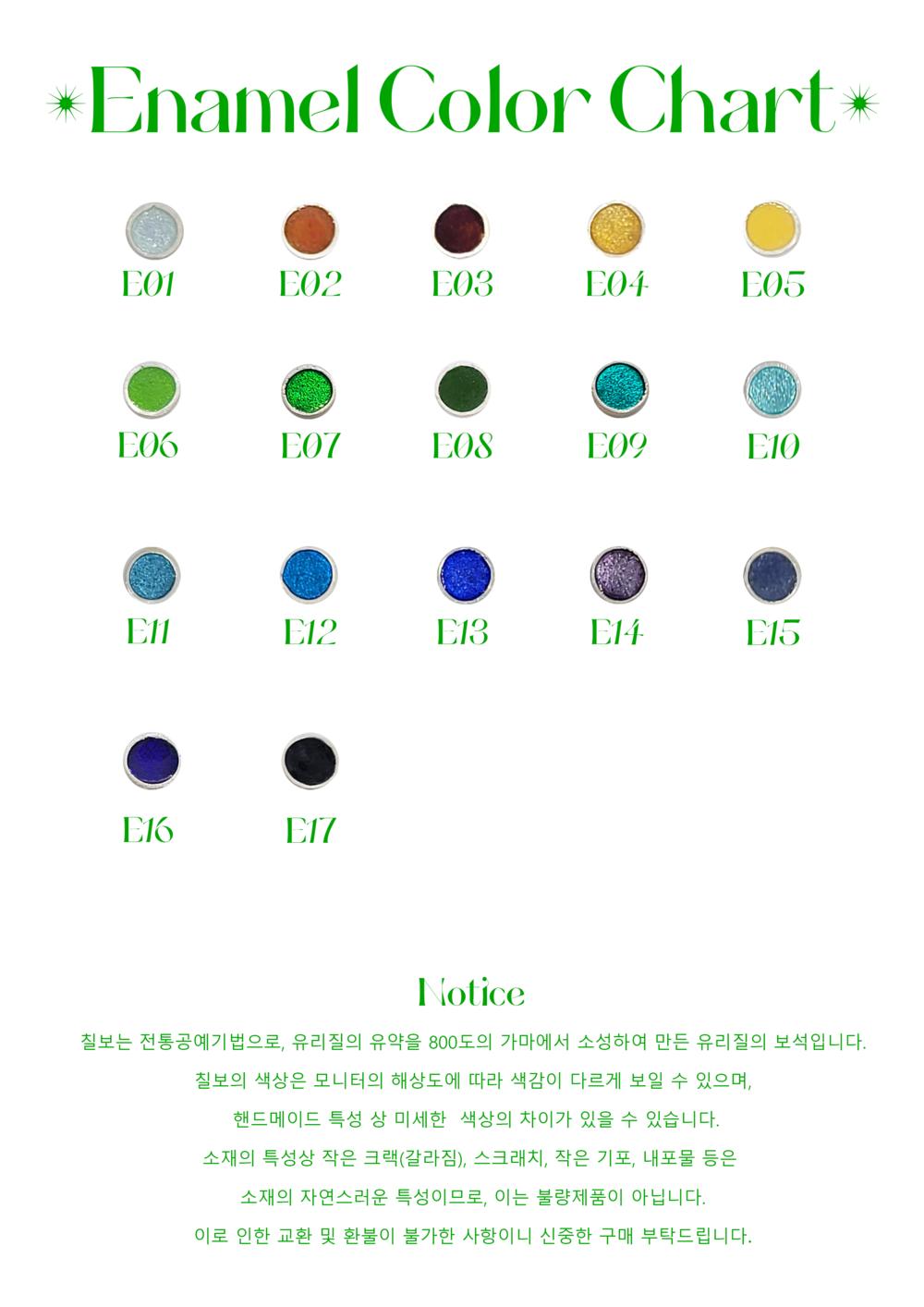*디자인의 따라 칠보 유약의 두께, 가마의 온도, 유약의 수분함유량, 소성시간 등의 차이로 컬러차트와 미세한 색감 차이가 있을 수 있습니다.